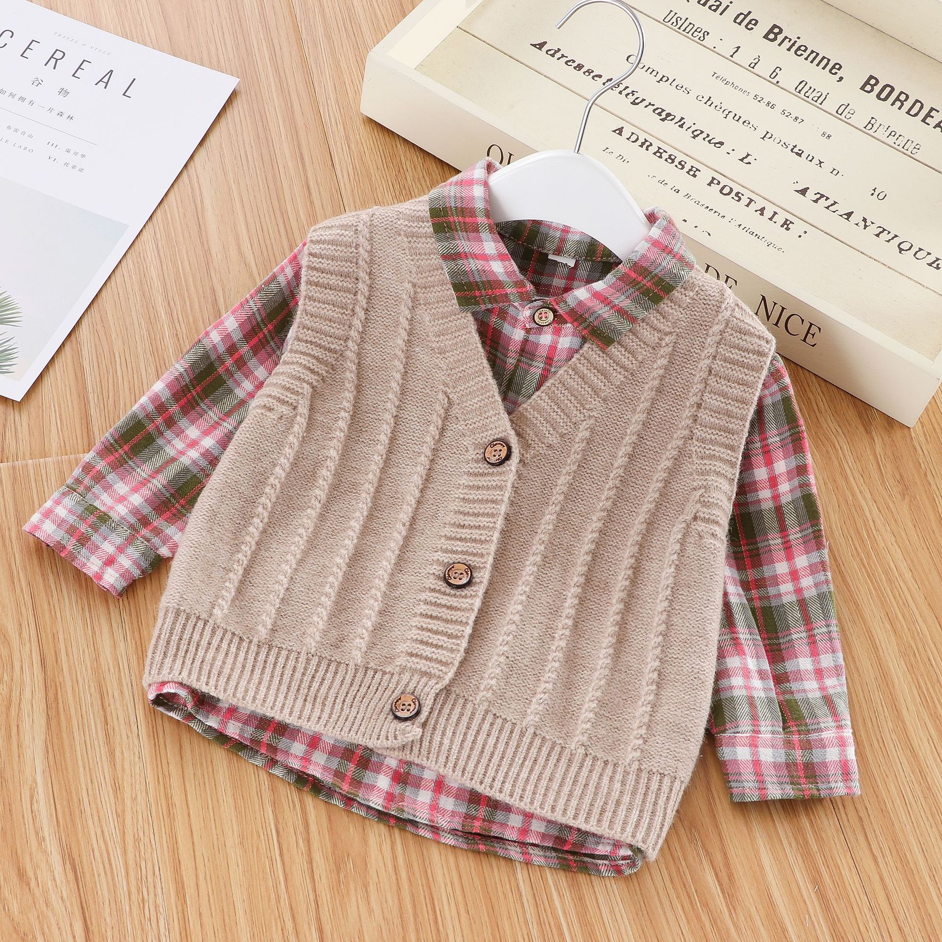 827 Spring And Autumn New Casual Children's Clothing Wholesale Children's Plaid Shirt With Wool Vest Two-piece Suit For Sale